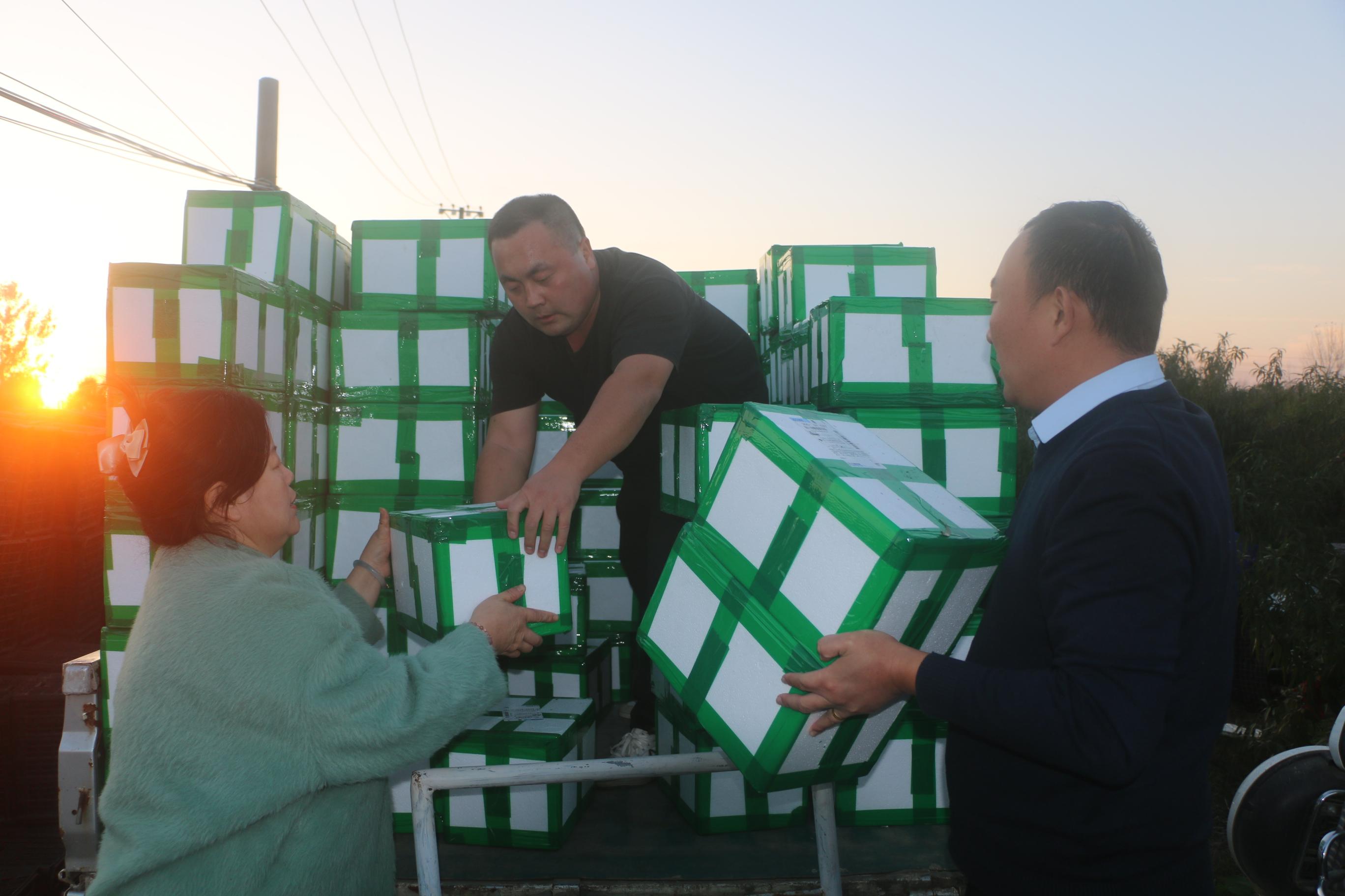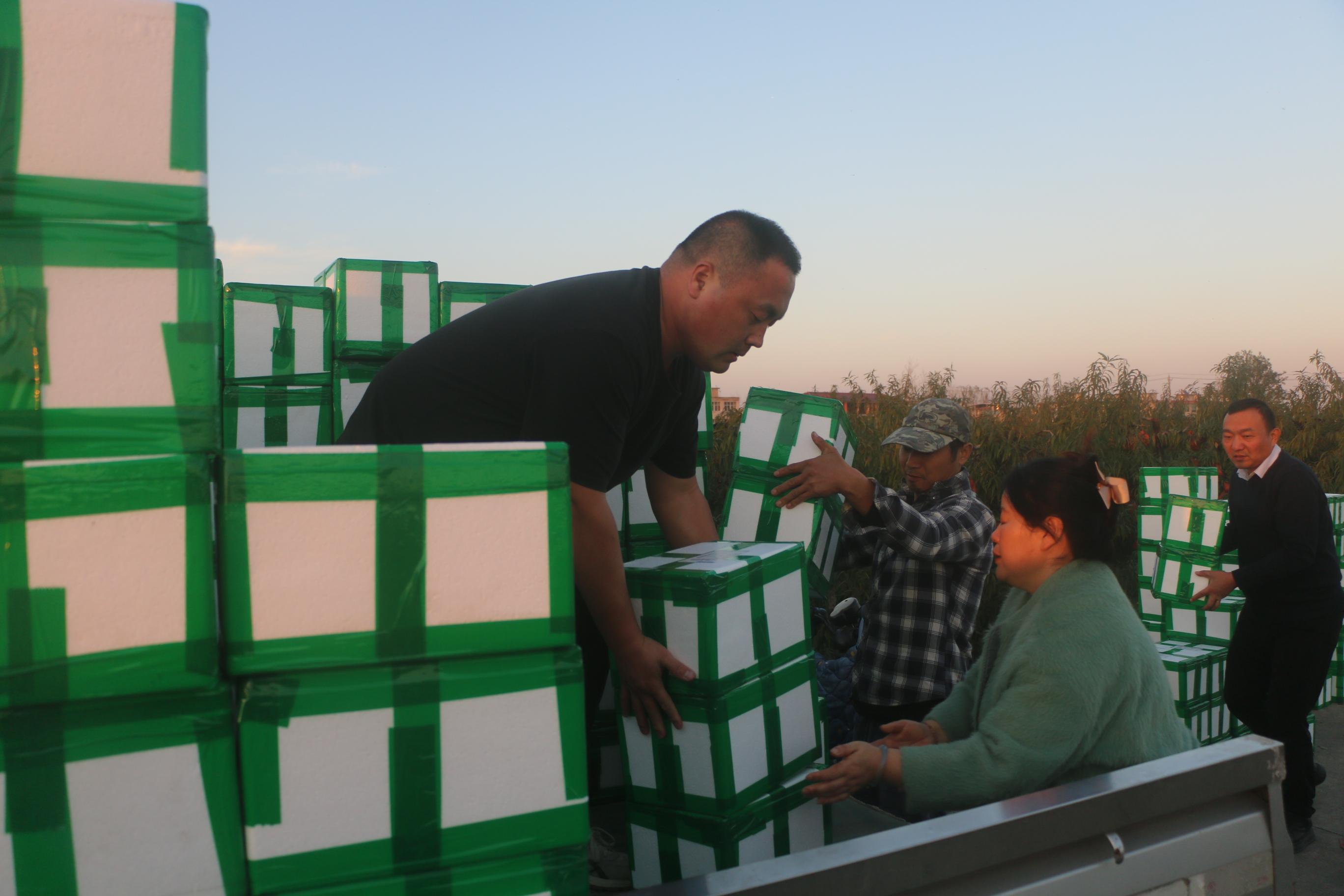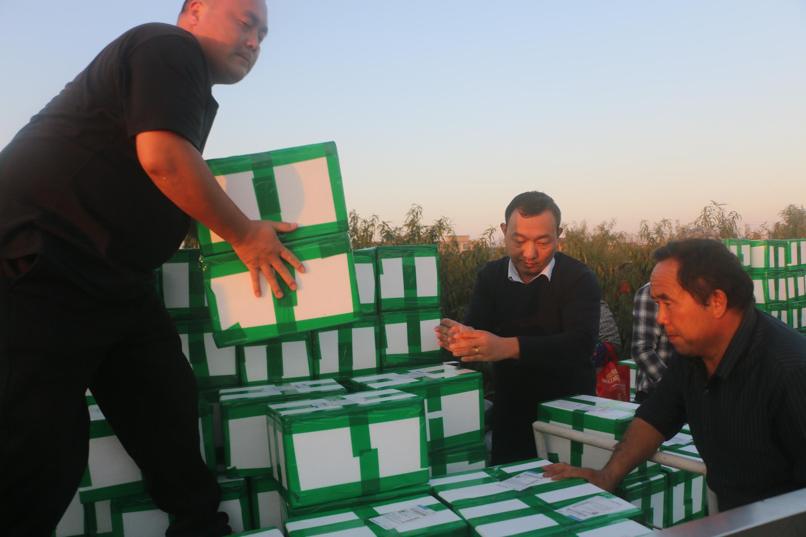 11月4日,胡军和张伟、关洪影三人开车来到会龙镇郜庄村张克龙的冬桃种植基地,把已分拣好的44箱440斤冬桃装上车,拉回阜南后发给认购冬桃的32名义工和爱心居民。